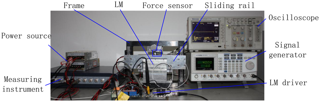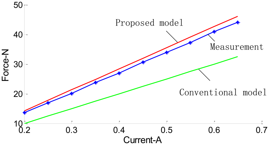 To obtain the relation between thrust force and current in the LM, the corresponding experiment is conducted as shown in Figure 16. After the air-gap MFD of the LM has been obtained, according to the Lorentz law, the thrust force of the LM is calculated using the integral method [1,30]. Figure 17 shows the thrust as a function of primary current density. It can be seen that the proposed SMEC method is more accurate than the existing method.