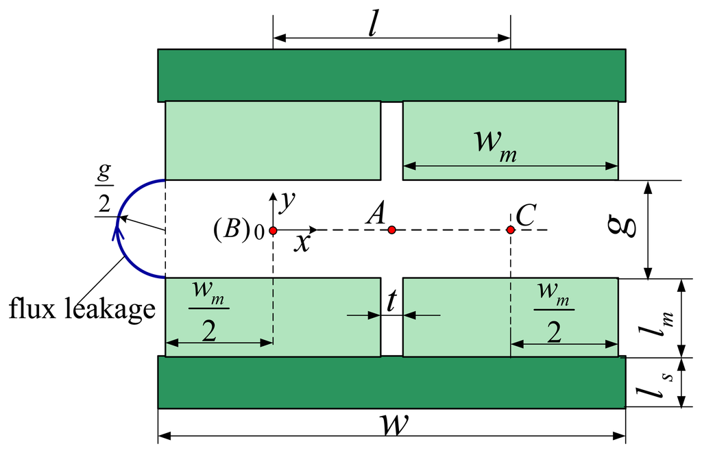 The route of the flux leakage can be regarded approximately as an ellipse as shown in Figure 10. Since the MFD of air-gap g is symmetrical about the x-axis, it can be deduced that the MFD of point-A ((wm+ t)/2, 0) is 0 as shown in Figure 3 and the analytical expression can be written as: