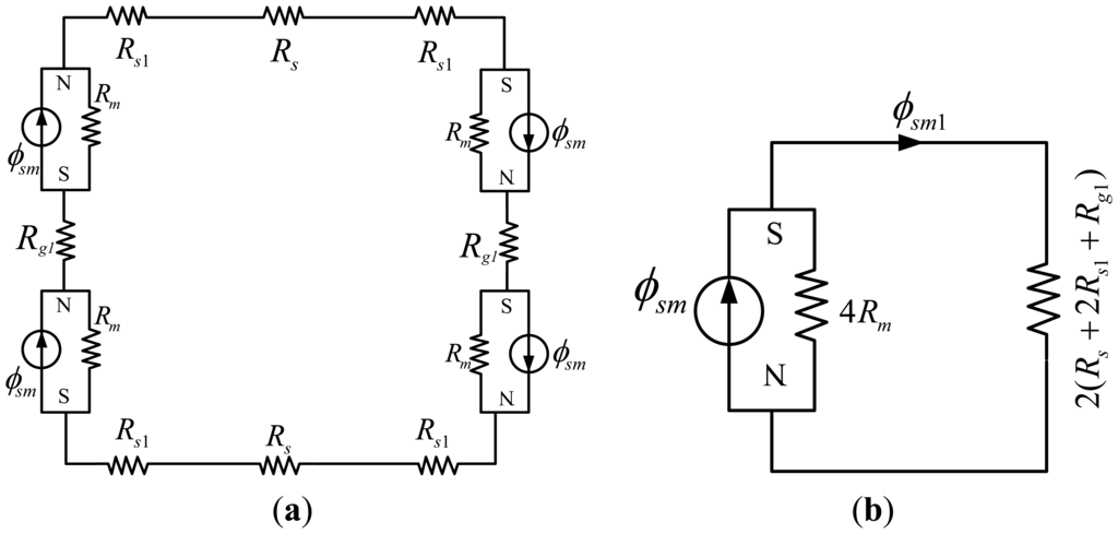 Figure 7(a) depicts the middle MEC. It can be simplified as in Figure 7(b), using the equivalent-resistance theory. According to the width of the corresponding flux tubes of Rs, Rs1 and Rs2 as illustrated in Figure 6, applying the formula of resistance yields: