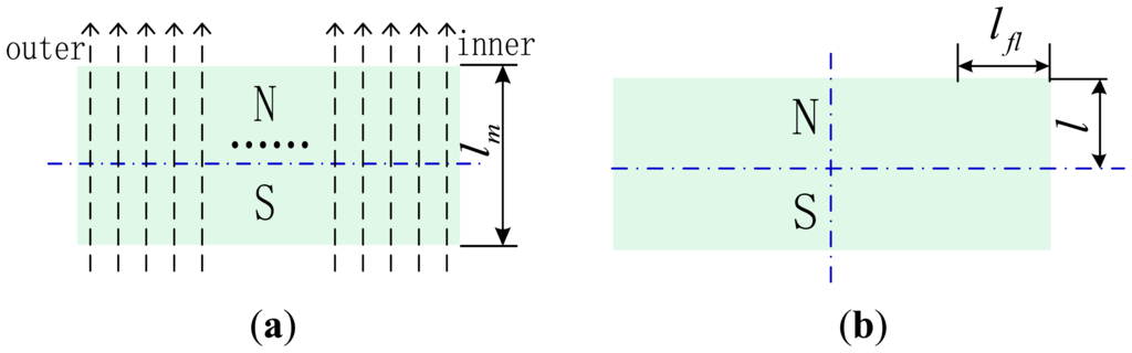 Here, it is assumed that under ideal conditions, MFLs pass through the PM evenly without leakage as illustrated in Figure 9(a). Then, magnet-end pole-to-pole leakage occurs. Here, lm is the thickness of the magnet pole and lfl is the width of the flux source of flux leakage as shown in Figure 9(b). Because flux leakage occurs mainly near the ends of the magnet pole, the width of the flux source of flux leakage lfl must be smaller than half of lm. In addition, for weak flux leakage, lfl is assumed to satisfy lm/4 = 1.875 mm.