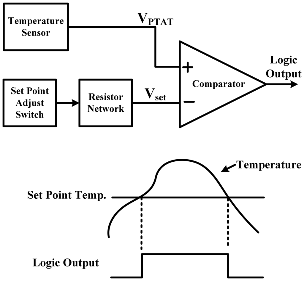 An on-chip temperature sensor with set-point programming, which functions as a thermostat, is required for temperature monitoring in various applications to prevent overheating or overcooling. They are mounted close to the microprocessor or other crucial heat sources and constantly monitor the operation temperature. Their features include logic-level output to indicate whether the temperature is above or below a preset value and a user-programmable temperature setting. A temperature sensor with a logic output is similar to a voltage output sensor, except that the output amplifier is replaced with a comparator, as shown in Figure 1. Temperature set-point programming is usually accomplished using an external resistor network or DAC [1–4]. The resistor values for achieving the desired trip-point temperatures are calculated using a universal formula relating to resistance. The output is high for VPTAT > Vset, and can be used to directly control the fan speed in a thermal management system to avoid thermal damage. Conversely, thermostats can also be used to avoid low temperature conditions. However, because the set-point cannot be digitally configured, it is costly to program multiple set-points, which is unsuitable for full VLSI integrations.