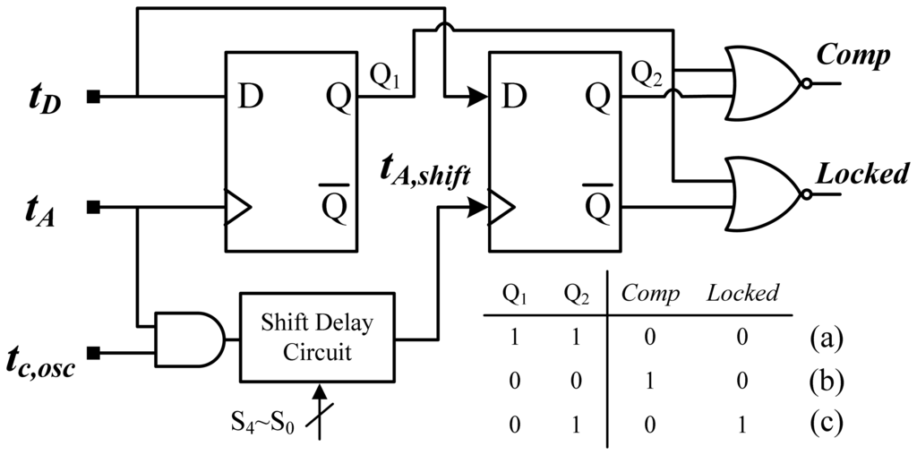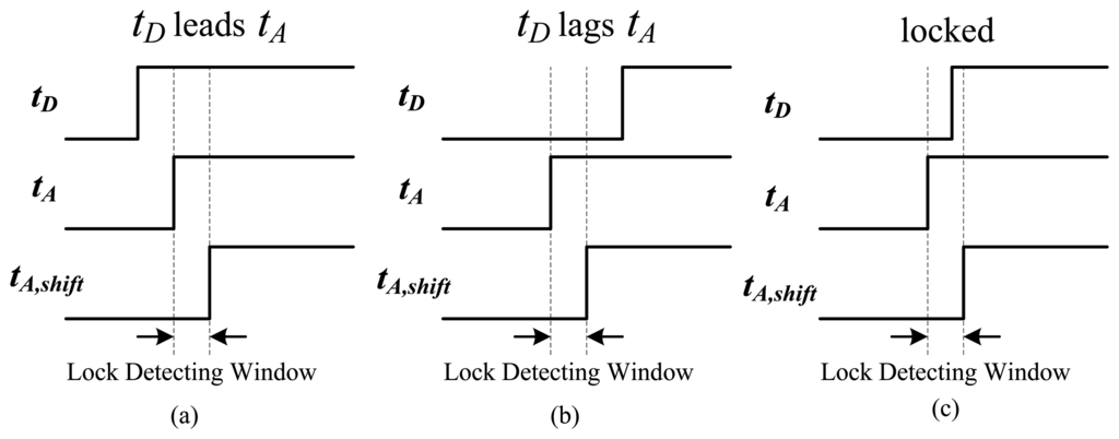 For over-temperature protection, the proposed time comparator with built-in custom hysteresis was used to determine the lead or lag relation between tD and tA. The schematic of the comparator is plotted in Figure 10 and it was modified from the phase detector in [12]. The shift delay circuit realized with a 5-bit AGTA can form the hysteresis of the desired temperature range. Two DFFs were used to sample the input signals, and the shift delay circuit set up a detecting window, formed by tA and tA,shift, to avoid chattering. The operation principle with three differing states is shown in Figure 11. In Figure 11(a), tD leads tA and tA,shift, which indicates that the test temperature does not exceed the set trip temperature. Consequently, an alarm signal cannot be activated. In Figure 11(b), the alarm is activated because the test temperature exceeds the set temperature. The output remains in the previous status when tD enters the detecting window, as shown in Figure 11(c). The same operation principle can also be used for under-temperature protection. The hysteresis of the temperature range can be set by the input value of the shift delay circuit and temperature resolution. For example, the 0.05 °C resolution and 5-bit design in the shift delay circuit can achieve a maximal hysteresis of approximately 1.6 °C. Because no hard limits occur in time-domain sensors, the time resolution tc,osc in the ARDC can be easily expanded to avoid time comparison errors caused by a dead zone or sampling window of the DFF. This substantially reduces the complexity of the circuit design.