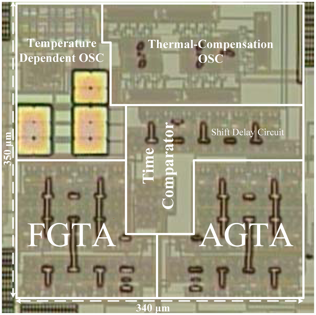 This paper presents a CMOS time-domain thermostat with digital set-point programming with a small chip area of 0.12 mm2 in a TSMC 0.35 μm CMOS digital process and a low power consumption of approximately 30 μW at a sample rate of 10 samples/s. Compared to conventional circuits, which require a DAC or external resistor, the time-domain circuit with an on-chip thermal-compensation oscillator and a timing generator was used to program the set-point temperature. A custom hysteresis of the temperature range in the time comparator can be easily adjusted by off-chip setting. The proposed circuit was designed to release unreasonable delay line length requirements by replacing the delay-line-based structure with an oscillator-based structure. In addition, the temperature resolution can be improved without substantially increasing the chip area. The thermostat achieved a resolution better than 0.05 °C and a ten-fold improvement in resolution. The time-domain curvature compensation technique was used for accuracy enhancement. With two-point calibration and a temperate range of approximately 0–90 °C, the measurement error was within ±0.6 °C, which is sufficient for on-chip thermal management systems. These specifications demonstrate the proposed circuit is very suitable for low-power and low-cost VLSI systems. The measured performances of the proposed thermostat and other time-domain temperature sensors are shown in Table 1 for comparison.