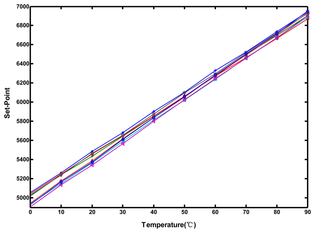 To determine the performance of the proposed circuit, measurements were performed in intervals 10 °C with a 0–90 °C temperature range in a programmable temperature and humidity chamber (MHG-120AF). The step input signal Start was issued using the FPGA control board. During the increase of test temperature, the input value of AGTA from low to high gradually was varied to evaluate the relationship between the trip temperature and the programmed set-point. The corresponding set-point value of the temperature at the time was determined according to the output of the time comparator. The measurement results for eight packaged chips are shown in Figure 13.