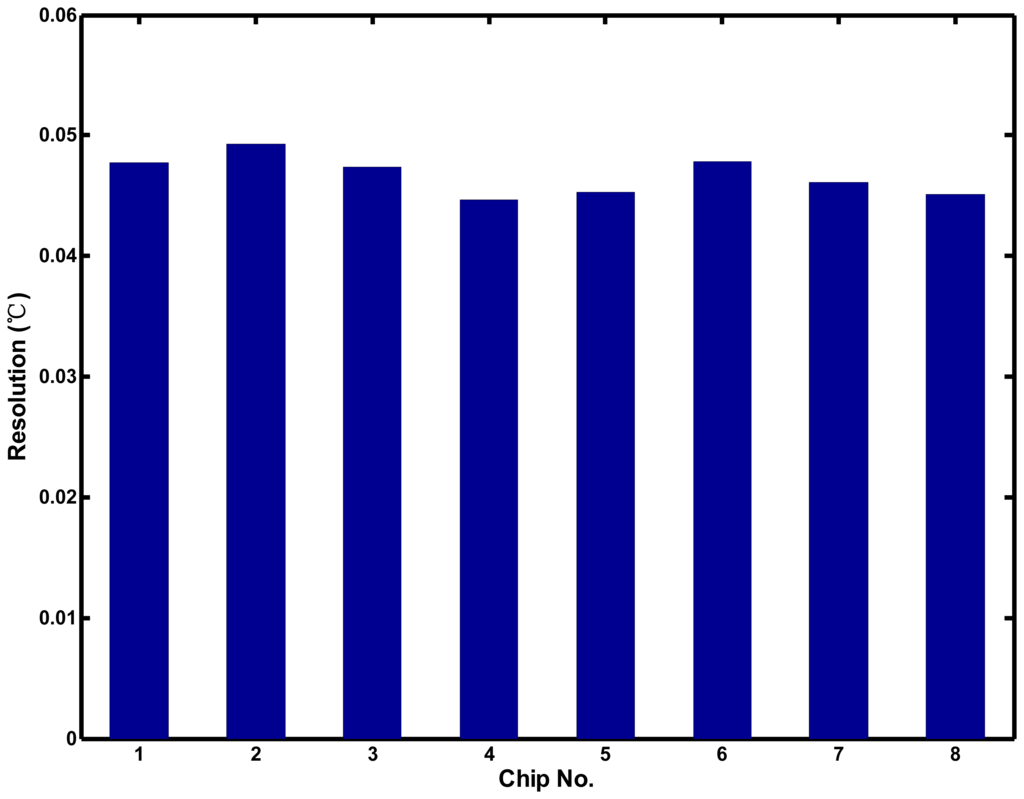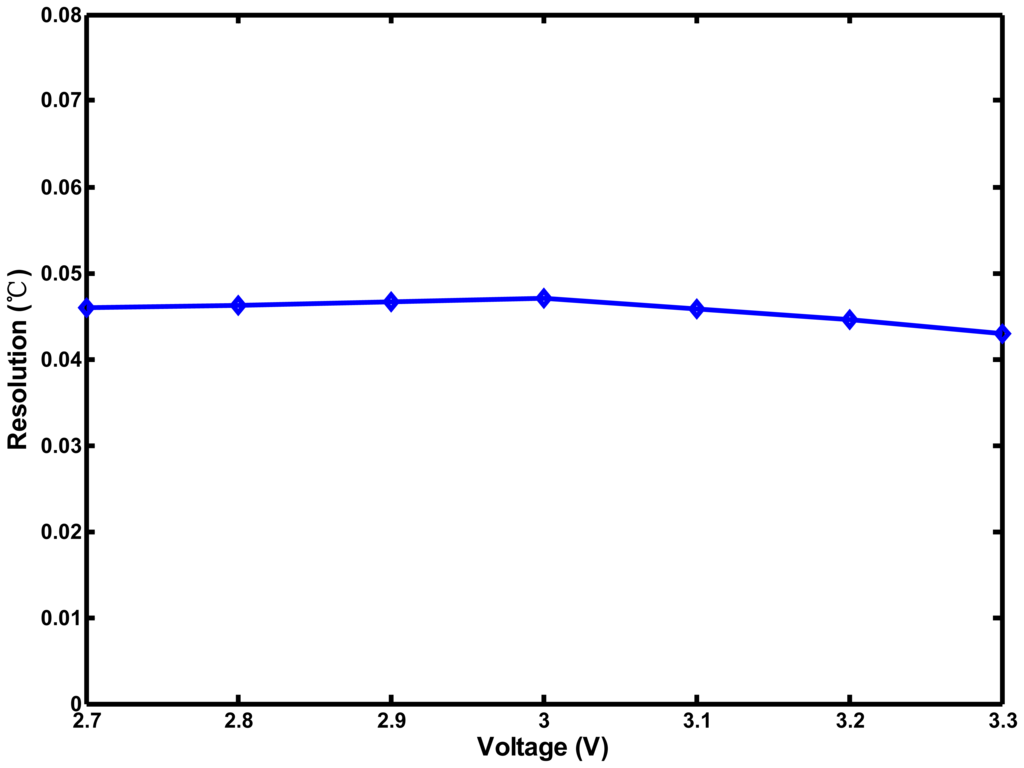 Figure 15 shows that the effective resolutions for eight chips were 0.045–0.049 °C, which are finer than those of most sensors [5–9]. The chip-to-chip variation of the resolution was only ±4%. Similarly, to demonstrate the supply voltage sensitivity of the proposed thermostat, the supply voltage was adjusted from 2.7 to 3.3 V in increments of 0.1 V. The generated delays of the TDDC and ARDC compensated for each other when the supply voltage varied, and the effective resolution of the proposed circuit was less sensitive to the supply voltage variation. The resolution varied from 0.043 to 0.047 °C or an equivalent ±4.5% variation, as shown in Figure 16. The proposed sensor owns good immunity to not only process but also voltage variations.