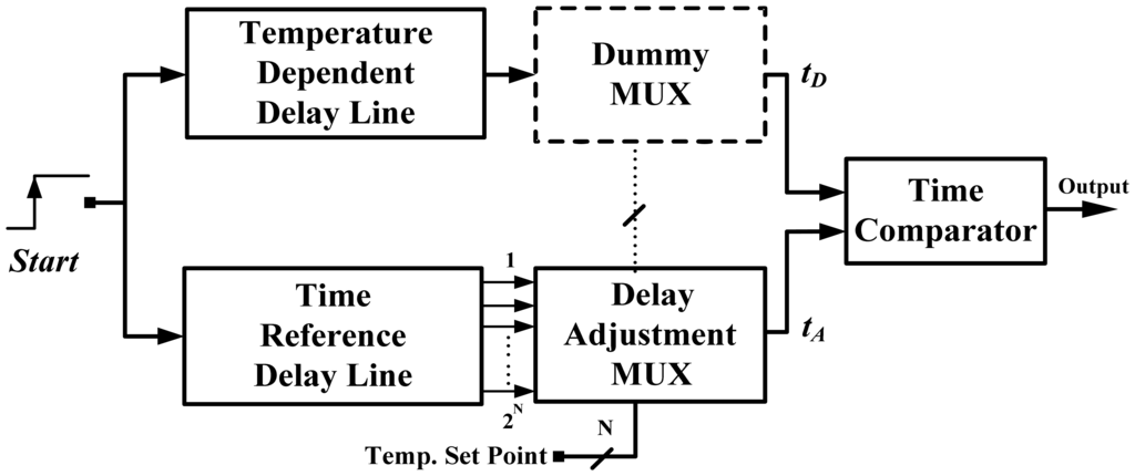 A time-domain thermostat substantially reduces the cost and power of temperature sensors for VLSI integration [5], as shown in Figure 2. The temperature dependent delay tD proportional to absolute temperature (PTAT) is produced by a simple delay line, and the adjusted delay tA is generated by another thermal-compensation reference delay line with a tap-point set by a multiplexer (MUX). A larger MUX input results in a later stage of the reference delay line being tapped out and a longer adjusted delay TA. The final set-point comparison was achieved using a simple D-type flip-flop (DFF) as the time comparator. Because all signals are processed in a time-domain instead of a conventional voltage-domain, the performance can be enhanced by scaling down the fabrication process. In addition, the circuit is composed of digital gates without the requirement of a BJT, DAC, or OPAMP, and the sensor can be easily integrated into the VLSI systems. However, the delay-line-based structure consumes a larger area with increasing resolution. With an 8-bit MUX design and more than 256 stages of delay cells with thermal compensation, the resolution was only 0.5 °C and the chip size was 0.4 mm2 in a TSMC 0.35-μm CMOS process. Moreover, because a significant curvature occurred on the transfer curve of the thermal delay tD, the sensor achieved a measurement error of ±1.0 °C over a temperature range of 0–75 °C after two-point calibration. For cost reduction and accuracy enhancement, this paper proposes a thermostat with two oscillators that are suitable for time-domain curvature compensation instead of using linear delay lines. A simple time comparator with a built-in hysteresis can provide an effective temperature alarm and temperature control. The remainder of this paper is organized as follows: Section 2 introduces the detailed circuits of the proposed thermostat; Section 3 presents the experiment results of the circuit; and lastly, Section 4 presents our conclusions.