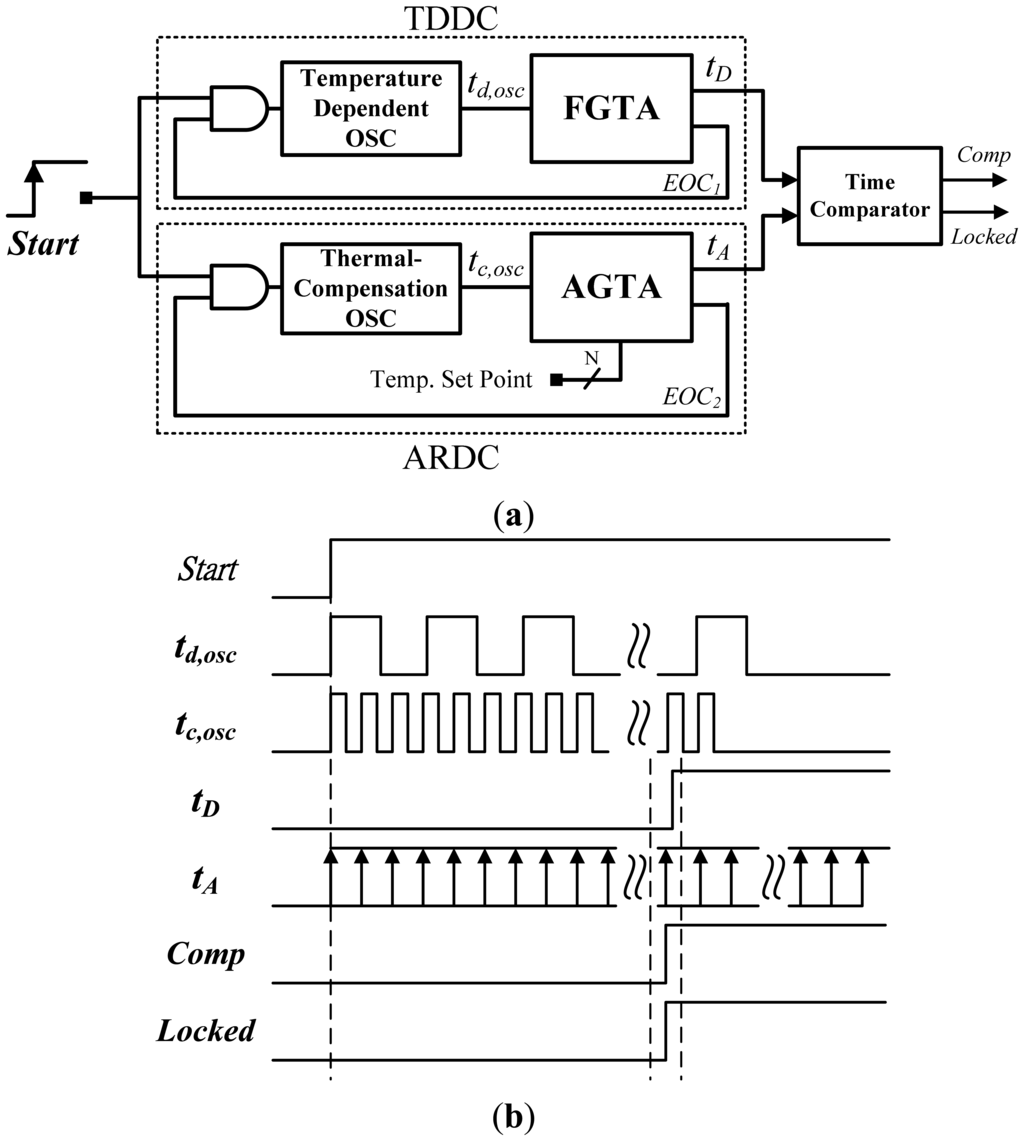 The proposed circuit is similar to that in [5], and the basic structure is shown in Figure 3(a). To further reduce the chip area and release the number of bits, the two oscillators and corresponding time amplifiers were used to replace the linear delay lines and MUXs. A temperature-dependent delay circuit (TDDC) composed of an oscillator and a fixed-gain time amplifier (FGTA) was used to generate a thermal sensing delay tD PTAT. An adjustable-reference delay circuit (ARDC) composed of another oscillator with thermal compensation and an adjustable-gain time amplifier (AGTA) was used to program a temperature set-point delay tA. The characteristic curve on the thermal-compensated oscillator was designed to match that of the thermal oscillator to improve accuracy. The timing difference between tA and tD was detected by the time comparator to output Comp/Locked. As shown in Figure 3(b), the Start triggers the two oscillators and the corresponding period widths, td,osc and tc,osc, are generated. Then, the PTAT delay tD related to td,osc is produced after time amplification. In the meanwhile, with tc,osc and the adjustable set-point values, the set-point delay tA is generated correspondingly. Finally, the states of Comp and Locked can be determined according to the relative delay between tA and tD. The following subsections provide detailed descriptions of the sub-circuits.