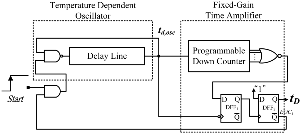 Figure 4 shows the detailed circuit of the TDDC. For temperature sensing, a retriggerable ring oscillator was composed of a NAND gate and a buffer-based delay line. The oscillatory period td,osc was determined by the propagation delay of those logic gates. The period width has a linear relation to the temperature variation, and can be used to sense the temperature [5–9]. Consequently, the oscillator can act as a time-domain PTAT sensor, which is simpler than voltage-domain sensors. The simple sensor has inferior linearity because a curvature occurs on the transfer curve of td,osc. The FGTA, modified from that in [9], is used for time amplification to obtain a sufficient temperature resolution. The additional DFF1 was inserted for deglitching. A larger preset input value results in higher output circulation times of the oscillatory period and a longer thermal delay tD.