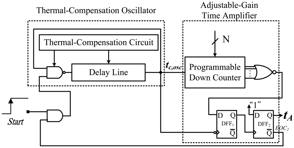 The thermal delay tD at the lower test temperature bound was usually larger than zero, and it caused an offset time. In [5], a lot of additional compensated delay cells were inserted at the beginning of the time reference delay line to compensate for this offset time. This resulted in a larger chip area and increased power consumption. In [6], the offset time cancellation circuit and designed trigger pulse width equal to the offset time were proposed to reduce the offset. However, this increased the circuit complexity. With the oscillator-based structure, the offset problem can be easily solved using one or two additional bit programmer down-counters. This does not considerably increase the design difficulty and chip area.