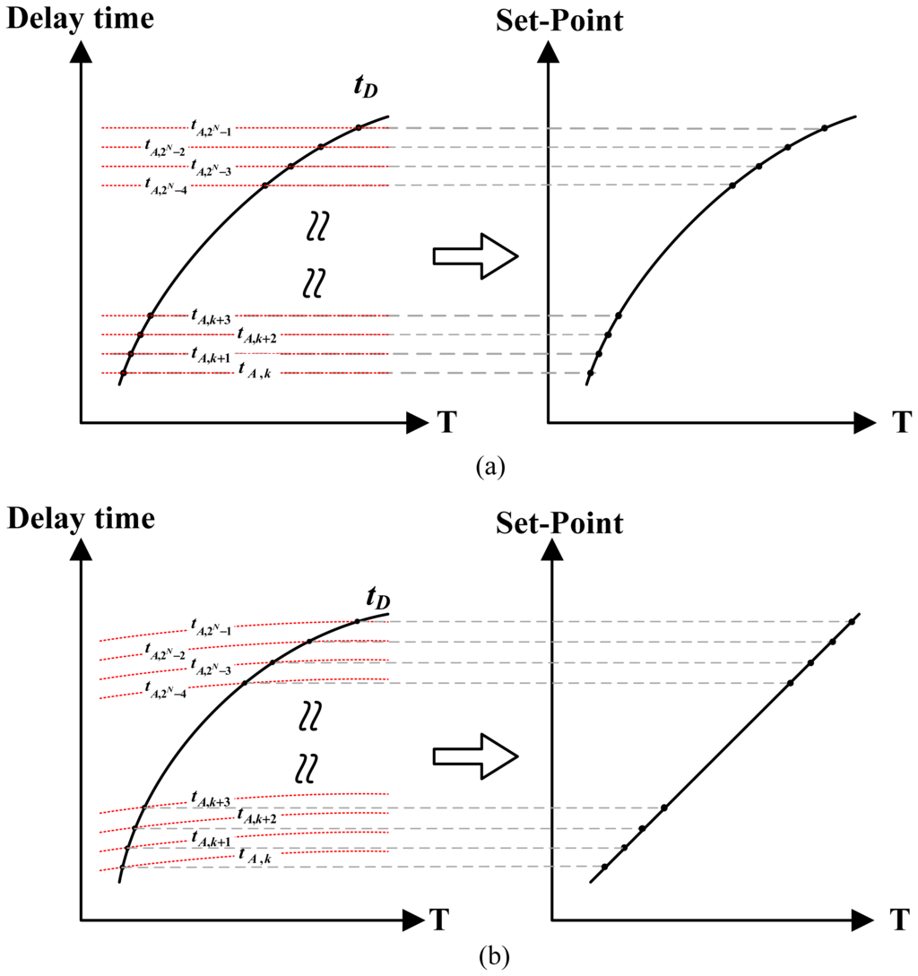 Furthermore, the ARDC was based on a cyclic delay line structure that can further reduce the chip area because the numerous compensated delay cells and their thermal-compensation circuits can be removed. Compared to the thermal oscillator, the period width of tc,osc must be temperature insensitive to act appropriately as a time reference. Although a reference clock can be easily used to replace tc,osc for the reference, the transfer curve of td,osc has some curvature, and the thermostat accuracy is limited. A feasible linearization technique for lowering the nonlinearity effect on the accuracy is to compensate for the curvature of td,osc using that of tc,osc [6], as shown in Figure 6. Therefore, the on-chip compensated oscillator rather than off-chip clock was used in this circuit for curvature compensation.