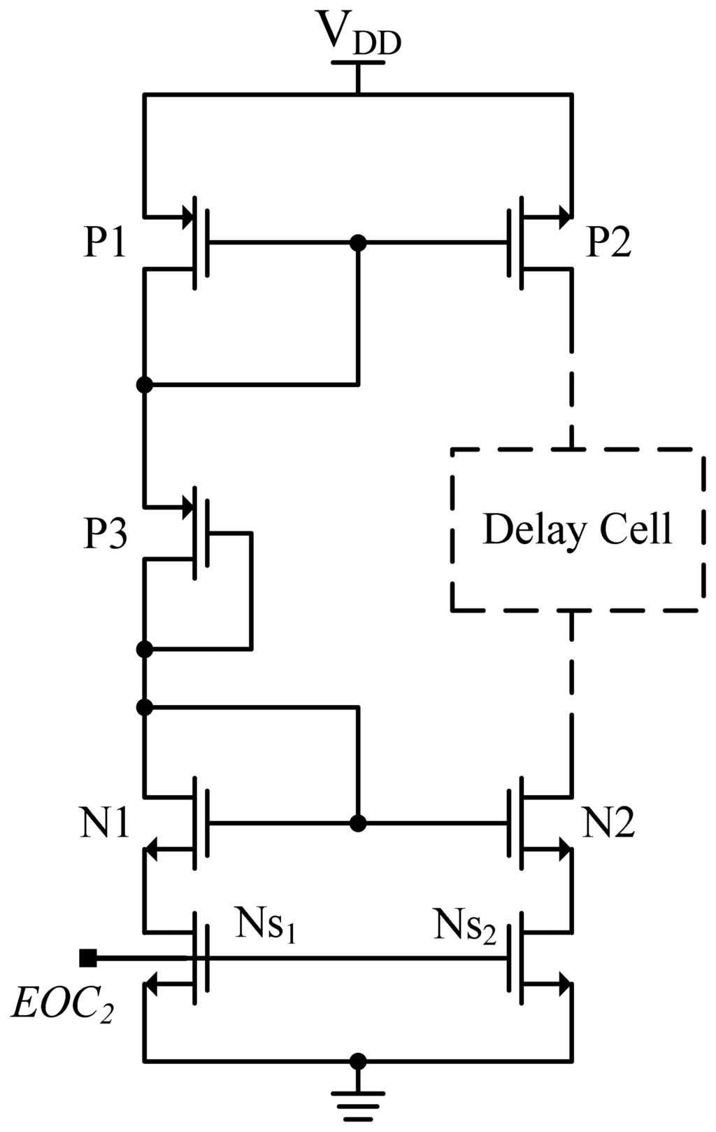 When km equals to −2, the conduction current becomes totally temperature-independent. Although the actual value of km spreads over −1.2∼−2.0 [11], the temperature dependence of delay cell is still reduced greatly. Equations (1) and (2) can be provided the first cut design to generate the period width of the oscillator with low thermal sensitivity. Then, the size of the thermal-compensation Transistors P3, P1, and N1 must be properly adjusted to make the curvature of tc,osc similar to that of td,osc. The Ns1 switch, which is controlled by EOC2, was used to shut down the quiescent current of the thermal-compensation circuit to reduce power consumption. To effectively match the source resistances of Ns2 and Ns1, the Ns2 switch is added to reduce the current mirror error. Similarly, the operation of the compensated oscillator can be turned off using ECO2 to further reduce power consumption.