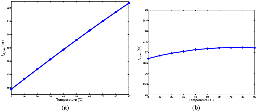 The simulation results of the two oscillators are shown in Figure 8. As descried above, the temperature-to-period transfer curve of td,osc with curvature is slightly convex. The curve of tc,osc is similar to the one in Figure 6(b) for curvature compensation. To decrease the power dissipation, the operating frequencies of two oscillators are designed to be low.