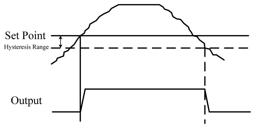 The proposed circuit with a programmable digital set-point was designed for use in thermal management applications. To prevent output chattering when the measured temperature is at (or near) the programmed trip point values, the thermostat must have the hysteresis of the desired temperature range. Figure 9 shows that the output remains in the active state until the temperature falls under the additional setting range. This hysteresis also can provide the function of temperature control to maintain the temperature of the system near a desired set-point.