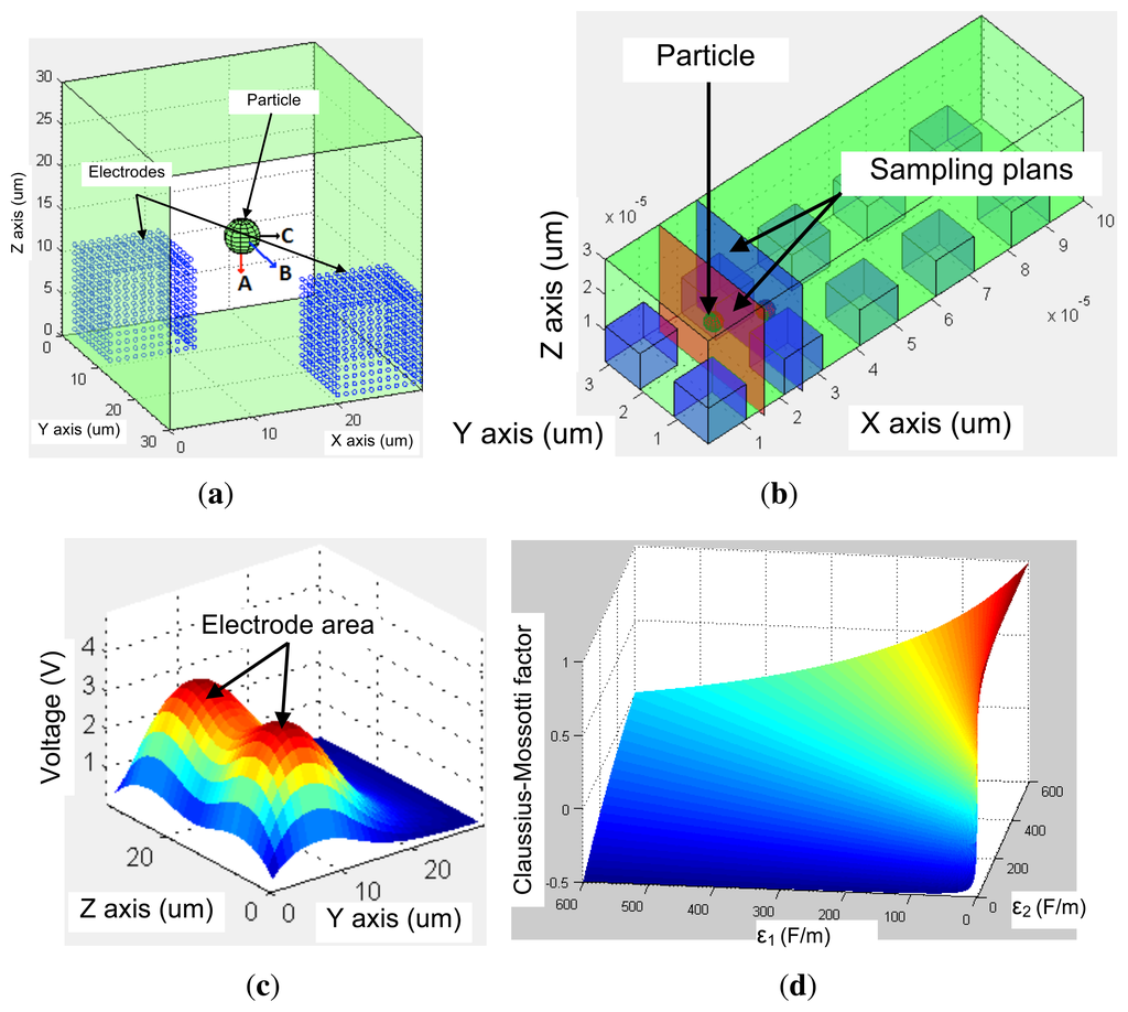 Figure 11 shows the proposed model behavior to achieve the simulations. First the model, sample the channel into different section depending on required steps as shown in Figure 11(b). Then, the voltage propagation imported from ANSYS and presented in Figure 11(c) is used to calculate electrical field propagation based on Equation (2). The latter is used to calculate the electrophoretic forces F⃗EP. The model also calculates the Claussius–Mossoti factor to find the dielectrophoretic forces F⃗DEP as shown in Figure 11(b). All calculated forces, in addition to the fluidic forces F⃗fluid, are applied on particle as shown in Figure 11(a).
