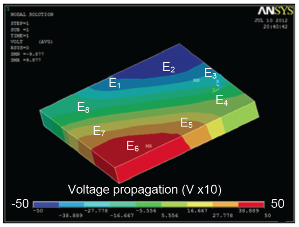 Next, the different electric forces can be computed from the potential distribution on the electrodes. Equation (11) shows the electric field distribution from the potential distribution.