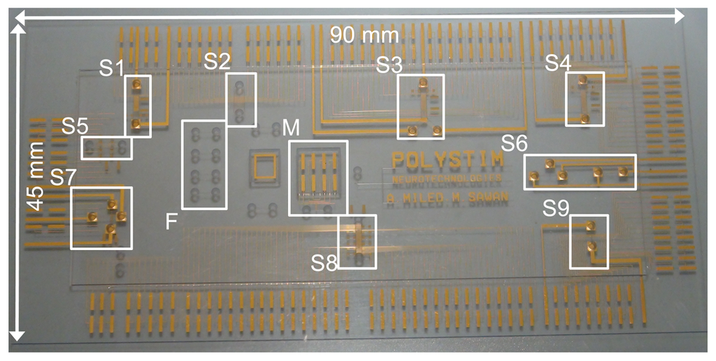The fabricated microfluidic substrate is made with two pieces of Borofloat glass, each with a thickness of 500 μm. The in-channel electrode thickness is 200 nm, the access holes diameter is 1.5 mm and the micro-channel depth is 40 μm. The microfluidic platform contains 9 different architectures, as shown in Figure 15. Only architectures S3 and S9 are used for experimental results. Other architectures are implemented for validation purpose only. Micro-tubes are sealed to access holes with epoxy Epotek-731 and connected to Cole-Parmer micropump.