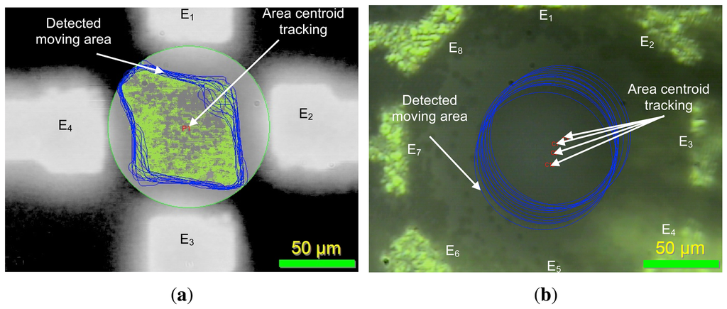 To validate the model results experimentally, we used the recently released ImagePro Premier software from MediaCybernetics. The software can do a 2D tracking of particles by making an average of global motion of a selected area by area centroid tracking as shown in Figure 18. This approach is coherent with this paper's particle motion example in the way that it starts from the center of each electrode architecture and is limited to 2D tracking only. Thus the comparison between the experiment and the model is limited to the X and Y axes only.