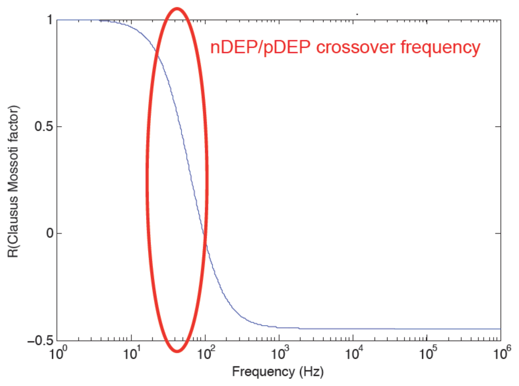 The Claussius–Mossotti factor K̲(ω) defines the frequency range of positive DEP and negative DEP, which correspond to attractive or repulsive effect, respectively The latter frequency range is defined by the crossover frequency as shown in Figure 2. K̲(ω) is given by Equation (3).