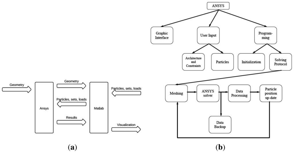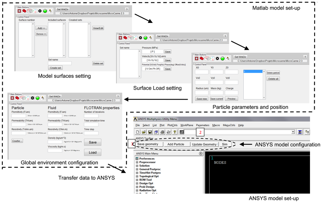 Consequently, the finite-element modeling software ANSYS is used, in conjunction with MATLAB as shown in Figure 3. The first step is the geometry production through ANSYSs geometry building functions. Thus, geometries are created in ANSYS and then exported to MATLAB. This format contains the list of all points, lines and areas used to produce the geometry. Using a custom graphical user interface, particle models are defined through MATLAB at the desired position with specified parameters such as mass, charge and radius as shown in Figure 4.