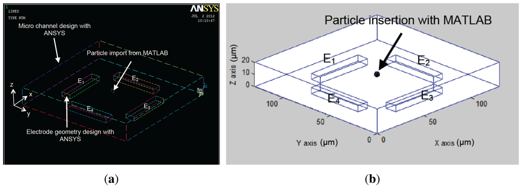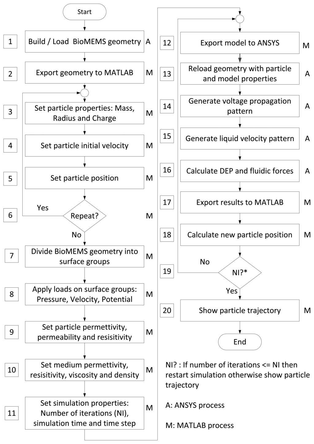 Finally, results presented in this paper correspond to a steady charge and conductivity of both medium and particles. However, it is easy to add a non-steady state medium and particle, as these parameters are set in MATLAB and can be redefined for each simulation step. Furthermore, the proposed model is limited to DEP manipulation, though it can be extended to other manipulations if they are implemented in MATLAB. The concept of this model consists of using ANSYS as a platform to get results from applied loads for different external fields, such as electrical or magnetic fields. MATLAB used these results in combination with particle properties to calculate particle displacement in a loop process (MATLAB-ANSYS). Ultimately, this proposed approach can be integrated directly to FEM software.