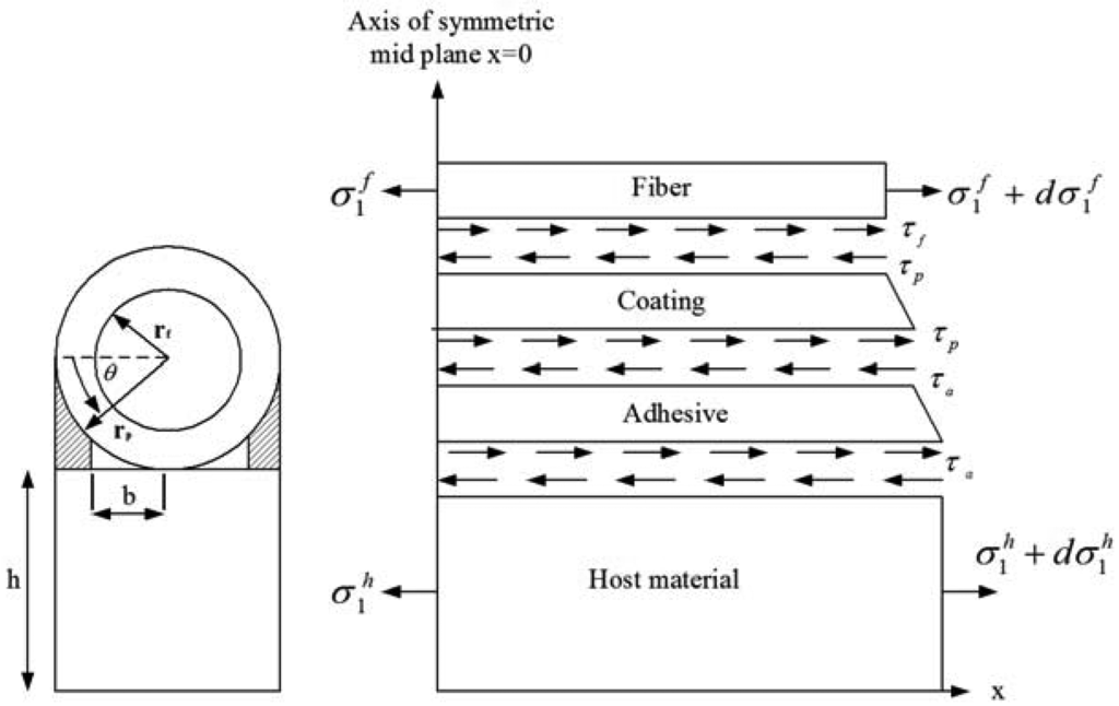 The analytical model is shown in Figure 1 with a cylindrical optical fiber and coating on the top and the host material under the bottom with adhesive in between. The host material is subjected to an uniform temperature change of ΔT. Thermal stresses can be generated due to the mismatch in thermal expansion coefficients between the optical fiber and host structure. The thermal strain of the optical fiber induced by the host structure due to the temperature change is transferred via the adhesive layer and protective coating.