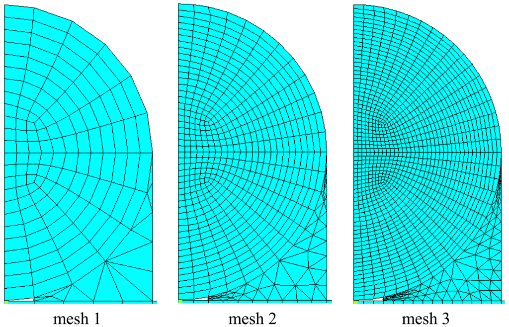 The theoretical prediction of the thermal strain in the optical fiber [Equation (22)] is validated by the finite element method using the commercial software ANSYS. Eight node elements (solid 45) were used to generate meshes. Three different meshes as shown in Figure 2 are employed to conduct the convergence test. The Young's moduli for the host material, adhesive, coating and optical fiber used in the numerical study are Eh = 72 GPa, Eα = 2 GPa, Ep = 0.0067 GPa and Ef = 72 GPa, respectively; while the thermal expansion coefficients are αh = 23 με/°C, αα = 20 με/°C, αp = 76 με/°C, αf = 0.5 με/°C, respectively.