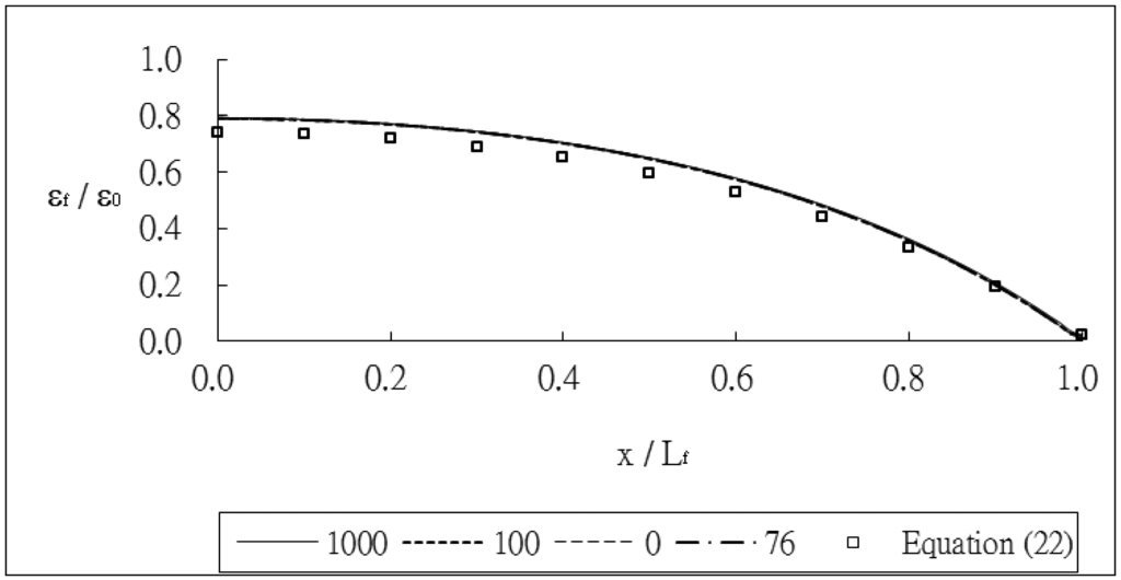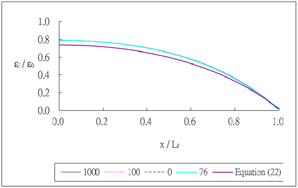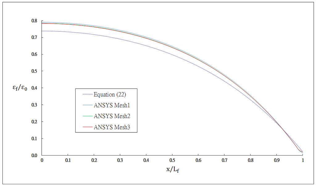 The outer radii of the optical fiber and coating are rf = 62.5 μm and rp = 125 μm, respectively. The thickness of the host material and bonded length are h = 8 mm and Lf = 20 mm, respectively. The index of refraction and Pockel's constants are n0 = 1.45, p11 = 0.12, p12 = 0.27, respectively. The thermal strain of the optical fiber along the surface bonded length calculated using Equation (22) and the finite element method are plotted in Figure 3. The thermal strain εf in the optical fiber shown in Figure 3 is normalized by the thermal strain of the host material ε0 = αhΔT. It shows that the theoretical predictions are in good agreement with the FEM results. A close agreement among these three different meshes demonstrates that the mesh is fine enough to converge toward the correct solution. The strain distribution of the optical fiber shows that the maximum thermal strain occurs in the middle of the surface bonded optical fiber and decreases to zero at both ends of the bonded length. The theoretical prediction of thermal strain Equation (22) is linearly dependent on the difference (αh − αf) of the thermal expansion coefficients between the host material and optical fiber and is independent of the thermal expansion coefficients of the coating and adhesive. The thermal strain of the optical fiber obtained using the finite element method with four different thermal expansion coefficients for the coating αp = 0, 76, 100 and 1,000 με/°C are presented in Figure 4. It shows that the thermal expansion coefficient of the coating does not affect the thermal strain of the optical fiber, which is in agreement with the theoretical prediction. Similar results were obtained while the thermal expansion coefficient of the adhesive was varied from αα = 0, 76, 100 and 1,000 με/°C as shown in Figure 5. In this investigation, the thermal strain is assumed to transfer from the host structure to the optical fiber via the shear deformations of the adhesive layer and protective coating. Thus, the thermal strain of the optical fiber can be dependent on the shear moduli of the adhesive layer and protective coating. Basing on the thermal analysis as described in Section 2, the thermal expansions of the adhesive and protective coating are cancelled out, leads to the optical fiber thermal strain independent of the thermal expansion coefficients of the adhesive and protective coating.