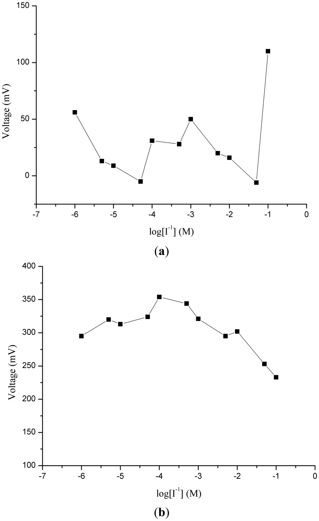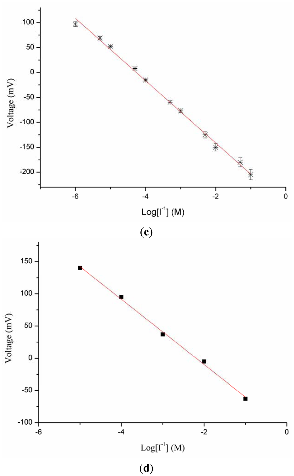 Potentiometric ion sensors with high selectivity and sensitivity, wide dynamic range of detection for the target analyte and fast response times are in high demand for routine analysis. In order to understand the role of ZnO nanotubes in the sensing mechanism, the same composition was pasted on gold coated glass and silicon electrodes. It can be seen from Figures 2(a,b) that the response of miconazole nitrate was found to be random and nonlinear. The reason for this behavior could be the loose attachment of the ion exchanger with the flat gold surface. This can also be inferred from Figure 2(c), which shows the potentiometric response of the iodide ion selective electrode based on the functionalized ZnO nanotubes with the ion exchanger miconazole nitrate. The iodide ion selective electrode based on the ZnO nanotubes demonstrated a highly linear range of detection from 1 × 10−6 M to 1 × 10−1 M for iodide anion with a good sensitivity of −62 ± 1 mV/decade and a regression coefficient of 0.99. The wide dynamic range of detection of iodide anion using the ZnO nanotube-based ion sensor confirmed the excellent performance of ZnO nanostructures due to the firm binding of miconazole membrane mixture on the surface of ZnO nanotubes. ZnO nanotubes exhibit hollow nanostructures which can carry a large number of miconazole ion exchanger membrane molecules and consequently a wide range of iodide ions is detected by the proposed selective iodide ion sensor. In order to understand the role of ZnO nanotubes, a comparative study was also carried by using the functionalized ZnO nanorods as shown in Figure 2(d). The functionalized ZnO nanorod-based iodide ion sensor showed a linear range from 1×10−5 to 1×10−1 M for iodide ion concentrations with a sensitivity of 51 ± 1 mV/decade. From this comparison it could be concluded that ZnO nanotubes having hollow structures compared to nanorods provide more surface area for the attachment of miconazole ion exchanger molecules which allows detection of more iodide ions, thus showing higher sensitivity and a lower limit of detection.
