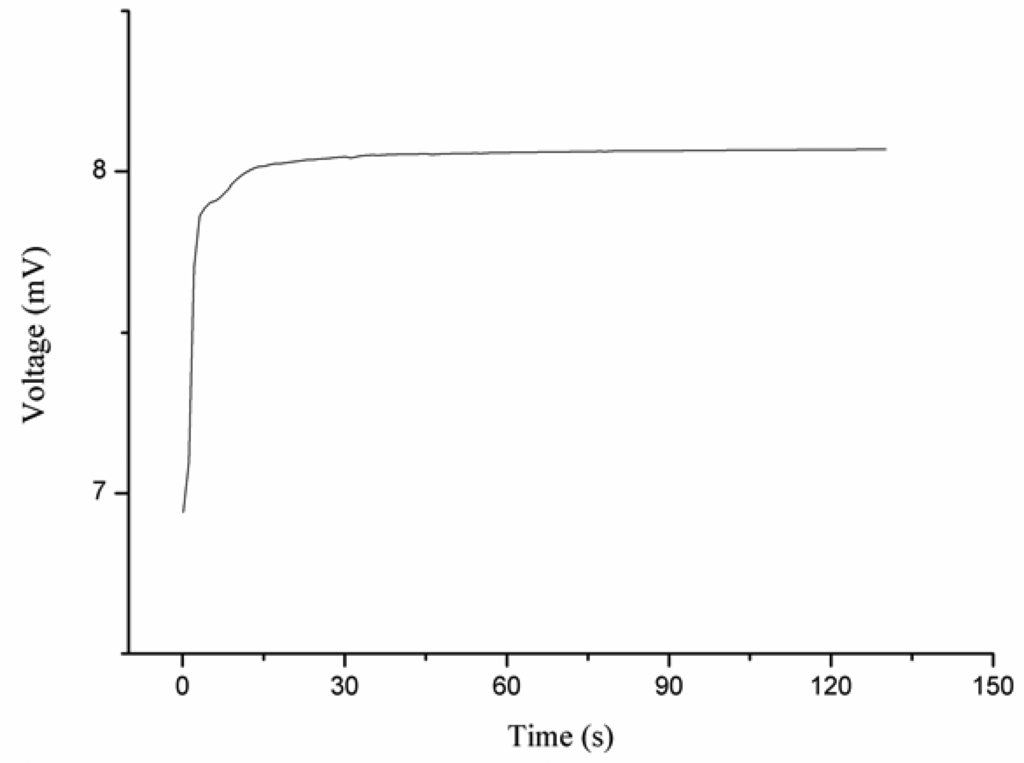 When the iodide ion sensor was tested in solution of iodide ion below 1 × 10−6 M, the response of the sensor was observed to be stable, but it was out of the linear range, so the detection limit was found to be 5 × 10−7 M. The effect of the volume of iodide ion solution on the output response of the ion sensor was also examined. The sensor showed no significant change in the output voltage for different volumes of the iodide solutions. The time response of the proposed iodide ion sensor was measured in different concentrations of iodide ion, and it was noticed that the sensor responded after about 10 s for 1 × 10−6 M iodide concetration. When the iodide ion sensor based on the functionalized ZnO nanotubes was employed in higher concentrations of iodide ion, the response time was found to be slightly less than 5 s, as shown in Figure 3.