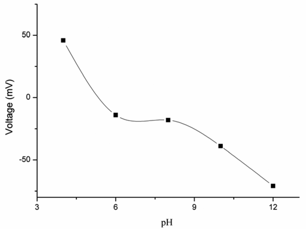 The effect of different pH values of 5 × 10−3 M potassium iodide solution on the potential response of the iodide ion sensor electrode was studied for pH values ranging from 4 to 12. The pH of the iodide ion solutions was adjusted by adding 1 × 10−1 M sodium hydroxide (NaOH) and 1 × 10−1 M hydrochloric acid (HCl). It was observed that at lower pH values the EMF was higher, but from pH 6 to 8 the EMF response was found constant, and at higher pH values the iodide ion sensor showed a dramatic change in the output response due to simultaneous sensing of iodide (I−) and hydroxide (OH−) by the ZnO nanotube-based iodide ion sensor, as shown in Figure 4. This behavior of simultaneous detection of iodide and hydroxide ion was also already described in the published work on the miconazole nitrate ion exchanger [41].