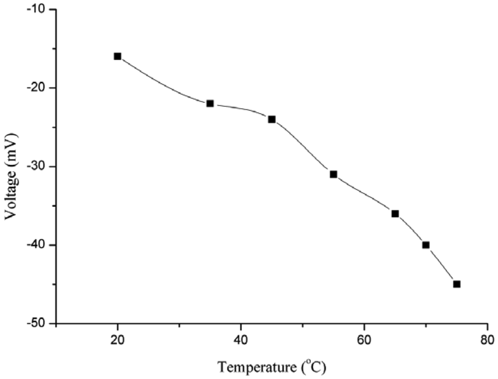 Temperature also has an influence on the EMF response of ion selective electrodes. Because of the different temperatures, the ionic mobility of the ions which are to be analysed is different, so the potential should change. For the study of the effect of temperature on the output response, the temperature was changed in steps of 10 °C. The range of temperature effect to be studied was selected from room temperature (23 °C) to 75 °C, as shown in Figure 5. The potential response was observed to increase up to 45 °C, but afterwards the response decreased because at the first the increase in output response was due to the increase in the ionic mobility of iodide ion and later at higher temperatures the decreased response might be due to two factors: the first is the high ionic resistance offered at high temperature and second may be the detachment of the miconazole ion from the surface of the ZnO nanotubes.