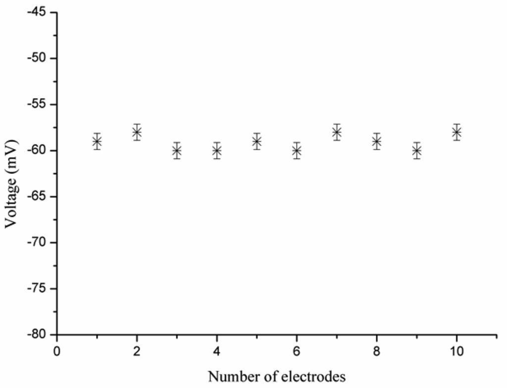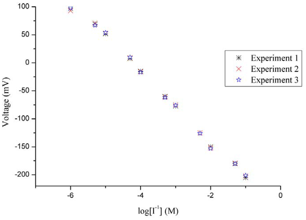 The evaluation of reproducibility for an ion selective electrode defines its response from one sensor to another sensor under the same working conditions. The reproducibility of 10 iodide ion selective electrodes was checked in 5 × 10−4 M solutions of iodide ion. The iodide ion sensor electrodes showed good reproducibility, with a relative standard deviation of less than 8%, as shown in Figure 6. In addition to reproducibility, the repeatability of the iodide ion sensor was also studied. When an independent iodide ion selective electrode was used for three days in the same detectable concentration range of iodide ion, the ion sensor proved itself showing almost same sensitivity, linearity, and response time, as shown in Figure 7.