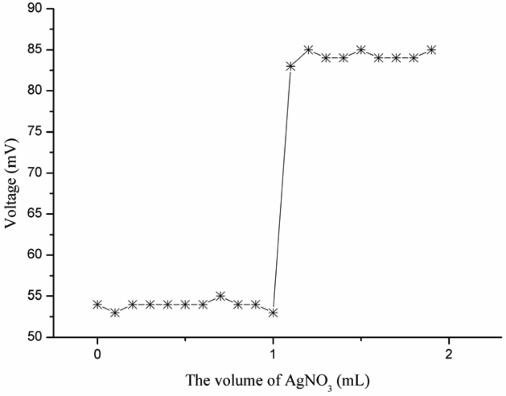The ZnO nanotube-based iodide ion selective electrode was used as an indicator electrode for the determination of iodide using the potentiometric titration method. The iodide ion selective electrode has shown a sharp intersecting point and confirmed its potential applicability as an indicator electrode when titrated in a 1 × 10−4 M solution of iodide vs. 1 × 10−2 M solution of silver nitrate [40], as shown in Figure 8.