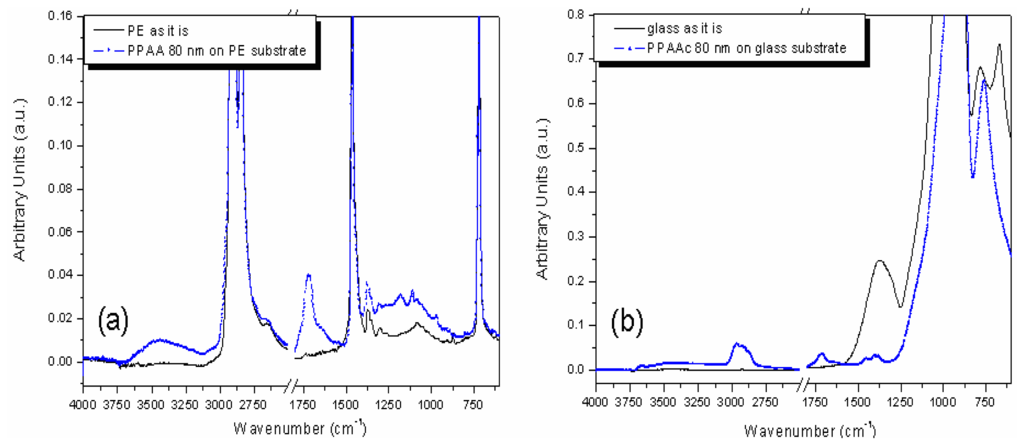 PE and Corning glass are considered as substrates. These two materials give rise to detectable IR absorptions because the penetration depth of the produced evanescent wave is larger than the thickness of typical deposited PPAA film. Therefore, substrate contributions hide PPAA features in different complementary portions of the selected spectral range.