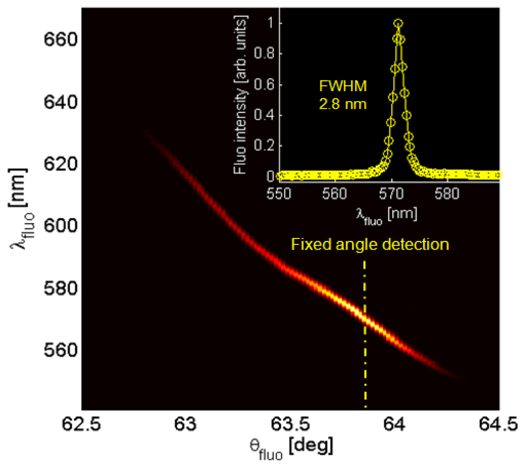 According to the goniometric spectroscopic scheme as depicted in Figure 1(a), angularly resolved fluorescence spectra are collected. The 1DPC is contacted with water and the laser excitation is resonantly coupled to BSW, in order to take advantage of the near field enhancement as reported elsewhere [21]. After blocking the reflected laser beam, a typical luminescence map F(θfluo, λfluo) is obtained as shown in Figure 3, in which the illumination is kept fixed at the BSW coupling angle for λ = 532 nm whilst the collection is angularly scanned in the range 62.5 deg < θfluo < 64.5 deg. Laser light is blocked by a diaphragm and an edge filter (Semrock 532 nm RazorEdge® ultrasteep long-pass edge filter). The detected fluorescence is mainly TE-polarized and shows an angular/spectral dispersion according to the BSW dispersion. For each collection angle θfluo a narrow BSW-coupled fluorescence peak is obtained, having a spectral width smaller than 3 nm (Figure 3, inset). The determined spectral width is proportional to the natural BSW resonance width convolved to the angular acceptance of the collection optics and it is not limited by the spectrometer resolution (<0.5 nm). The bright fluorescence peaks that can be obtained in this way result from the enhanced excitation provided by the BSW-coupled laser illumination and the coupled emission into BSW modes [21].