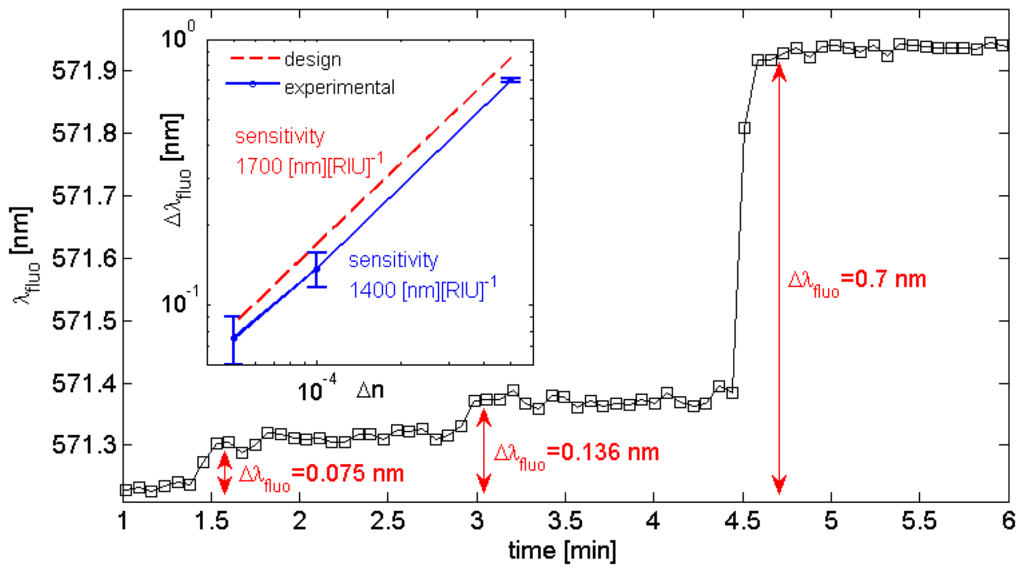 The overall spectral shift produced by the change of the refractive index in the aqueous medium is estimated after few seconds, when the signal is roughly stabilized. Then, an estimation of the noise is performed by taking into account the in-time fluctuations of the peak position about a mean value. When the estimated spectral shift values Δλfluo are plotted against the corresponding Δn (Figure 4, inset) an estimation of the sensitivity Δλfluo/Δn ∼1,400 nm/RIU is obtained. Typically, the uncertainty level is affected by the BSW-coupled fluorescence intensity and it has been estimated as δΔλfluo = 3 × 10−2 nm in the present case. In Figure 4 (inset), the expected sensitivity from the calculated design is also reported.