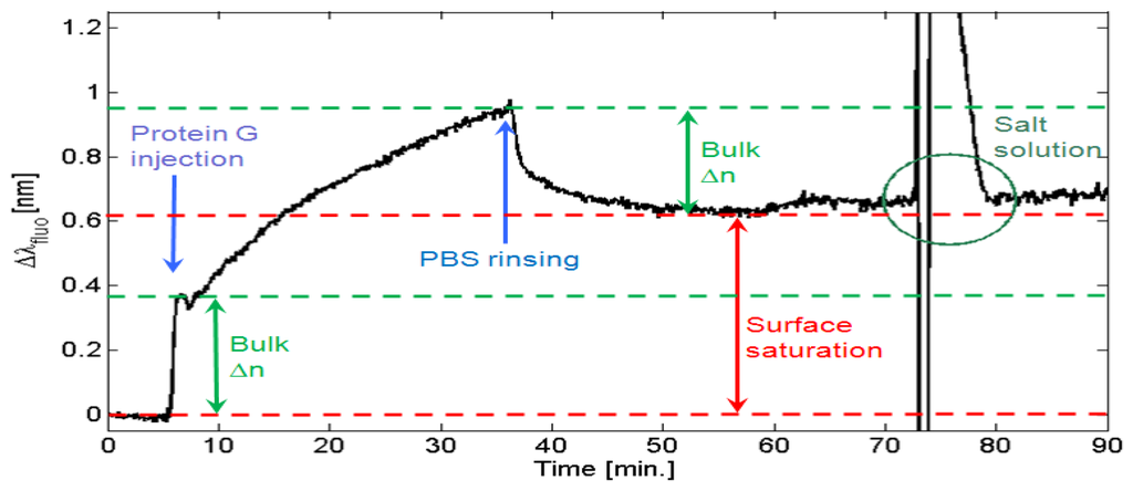 Initially, the BSW peak position is left stabilizing in a PBS buffer solution. After few minutes, a 300 μL volume of the protein G sample solution in injected and then made recirculating. At injection, a fast redshift of the BSW peak is detected. Subsequently, the redshift monotonically continues with a typical trend indicating the approach of an asymptotic condition. During this stage, protein G molecules are grafting onto the polymeric surface. After washing and recirculating with PBS solution, the BSW peak experiences an initial quick blueshift that stabilizes after few minutes at a Δλfluo = 0.6 nm with respect to the initial position. This overall redshift is due to the surface coverage of protein G. Interestingly, the blueshift observed during washing is quite comparable to the redshift observed at the injection of protein G. We account those spectral shifts mainly to the bulk refractive index changes of the solution only (indicated as “Bulk Δn” in Figure 6). In order to ensure that no protein G overlayers (i.e., excess of protein G molecules eventually stitched on the surface due to electrostatic forces and not by virtue of the amidic bond), the flow rate has been increased at t = 60 min. This effect is perturbing the measurement of the BSW peak. However, no substantial blueshift due to the removal of an eventual excess of protein G is produced. A more effective removal of eventual overlayers of protein G is performed by introducing a highly concentrated NaCl solution [33]. A 1 M NaCl solution is injected at t = 73 min and the resulting refractive index perturbation is so strong that the BSW peak runs out of range. After washing with PBS, the BSW peak is substantially recovered, meaning that no overlayers are present. However, some additional redshift is observed. We account this effect to an excess of protein G previously uptaken by the fluidic circuit walls and then removed by the NaCl solution and re-diluted in the final PBS solution.