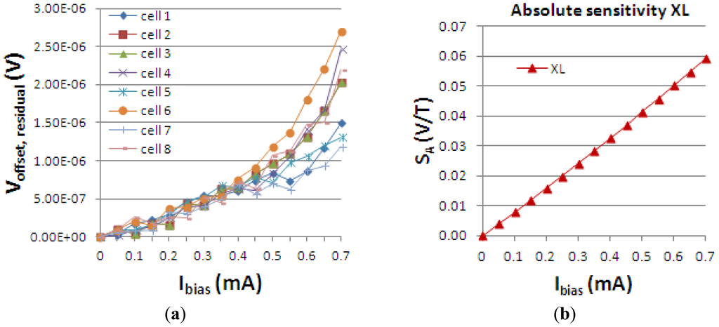 In particular, the residual offset mathematical function of the biasing current has a quadratic dependence, for the 2-phases spinning current [9]. The same quadratic increase of the residual offset with the biasing current is also observed by Demierre [10] in the Hall plate. In our case (Figure 1(a)), for 4-phases spinning current, as expected, the thermoelectric contribution proportional to Ibias2 in the residual offset, cannot be completely compensated for Ibias > 0.5 mA.