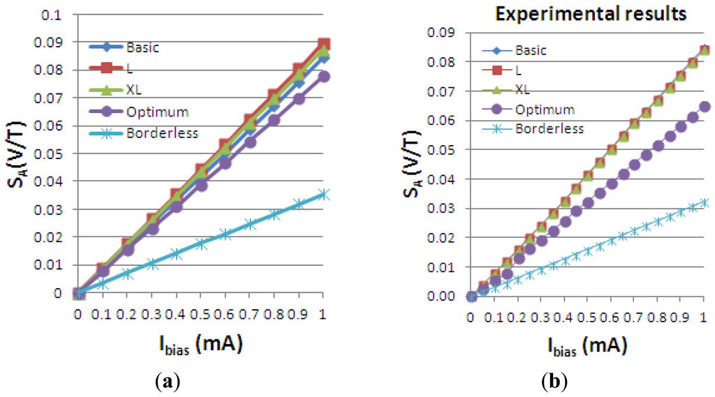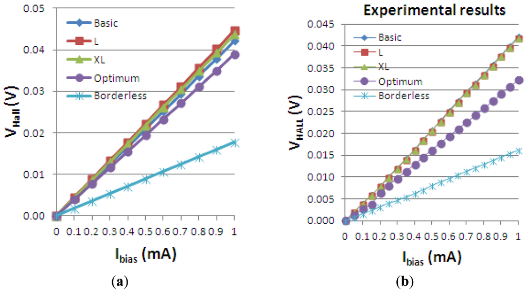 The Hall voltage of all the simulated structures is presented vs. biasing current in Figure 13(a). To assess the validity of the results obtained, we also added the measurement results for the five Hall cells in Figure 13(b). The cross-like cells have the same L/W ratio and they only differ by the scaling factor. Therefore, according to the definition of the Hall voltage in Equation (1), they are expected to have approximately the same VHall. By investigating the obtained graph, the following numerical values are extracted. At maximum biasing current, VHall = 42 mV for basic cell, VHall = 44 mV for the L and XL cells, VHall = 17.7 mV for the borderless cell and VHall = 38 mV for the optimum cell, respectively.