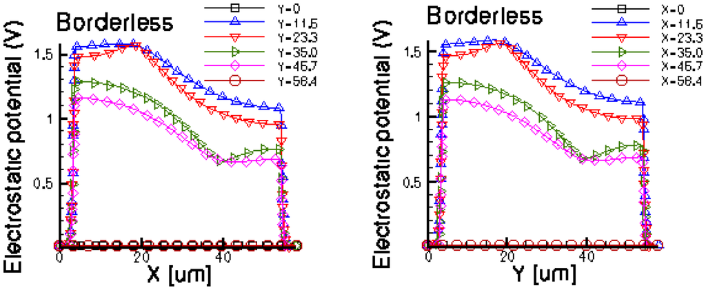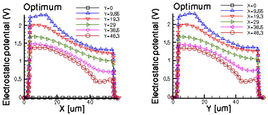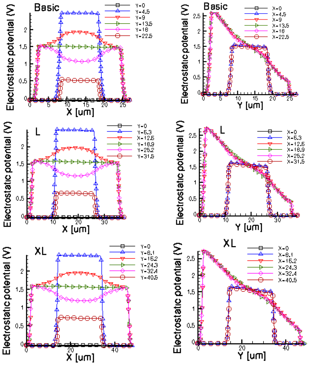 Figures 14 and 15 present the electrostatic potential at the surface of the devices (Z = 0) for all simulated cells in the case of 1 mA biasing current and magnetic field B = 0.5 T with orthogonal cuts on Oy and Ox respectively, applied on the 3D Hall Effect devices structures, as presented in Figures 8–12. Therefore, the Ox and Oy are the regular axes of the three-dimensional structures, as presented in Figures 2–6, corresponding to the sides of the p-substrate onto which the devices are built. Among the cross-like structures, the maximum electrostatic potential is on the biasing electrode a. It is equal to 2.6 V for the basic cell, 2.7 V for the L and XL cells respectively. As the theory indicates, the absolute sensitivity of Hall cells fabricated under the same technological process is only dependent on the geometrical correction factor G which in its turn is directly proportional to L/W. Therefore, for shapes with the same length to width ratio L/W, it is expected to have the same sensitivity.