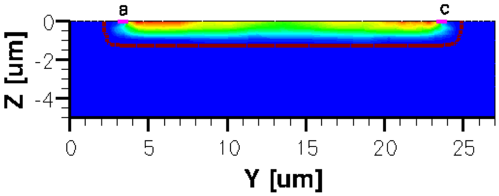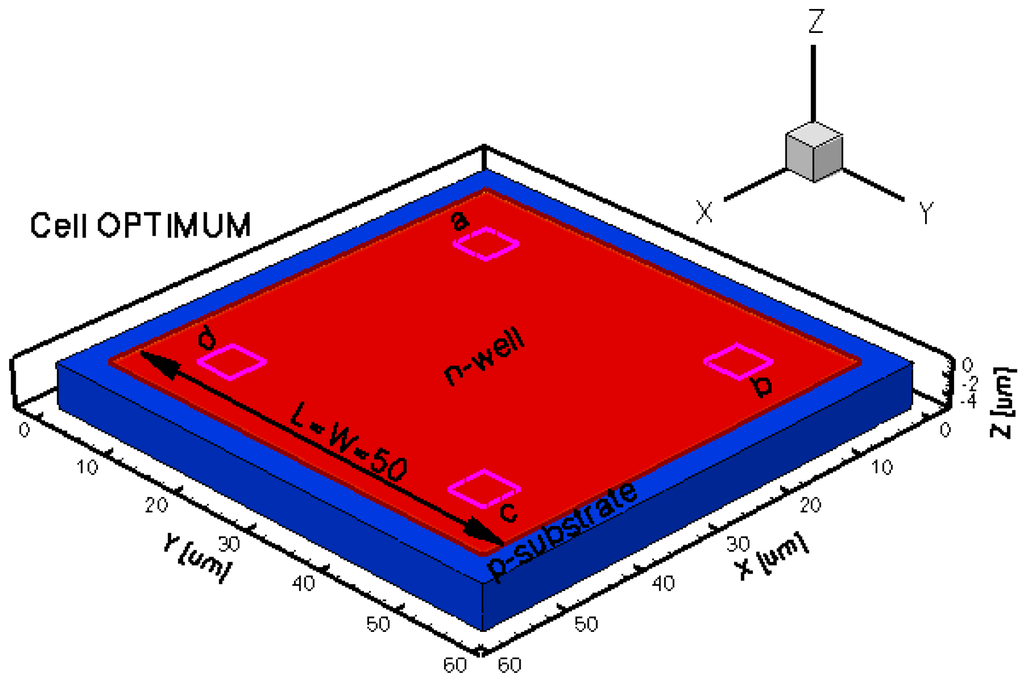 Therefore, a p-substrate with 10+15 cm−3 boron concentration and an active n-well region doped with 1.5 × 10+17 cm−3 arsenic concentration in the form of a Gaussian profile implantation were used. This doping profile allows an average mobility of 0.0630 m2·V−1·s−1. The thickness is 5 μm for the p-substrate and 1 μm for the implantation of the n-doped profile active region, respectively.