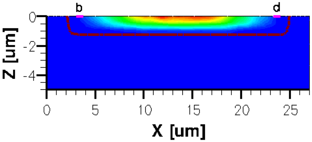 The three-dimensional representations of the five simulated geometries are illustrated in Figures 2–6. The p-n junction is depicted by the line on the active region borders. The four electrical contacts (a-d) used for biasing and measurement purposes are depicted as well.