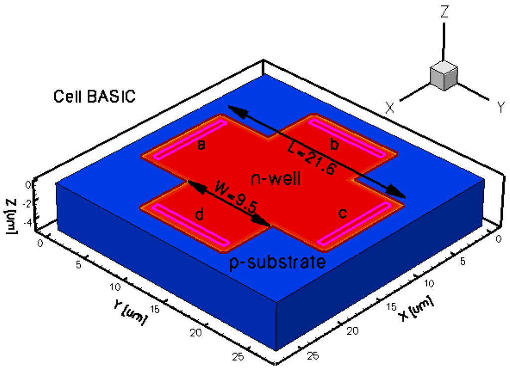 The geometrical design parameters of all the five simulated Hall Effect devices are given in Table 1. L and W stand for the cell length and width, respectively, while s represents the contact length. The width of the contacts is in general provided by the technology used in the Hall Effect devices fabrication process. In our simulations it was considered to be 0.7 μm. The distance from the contacts to the n-well borders is 0.35 μm for basic, L and XL cells, 13.85 μm for borderless cell, 5.5 μm for optimum cell. These values were omitted on the drawings for aesthetic purpose. The position of contacts with respect to borders is important in the offset analysis as contour errors might increase it.