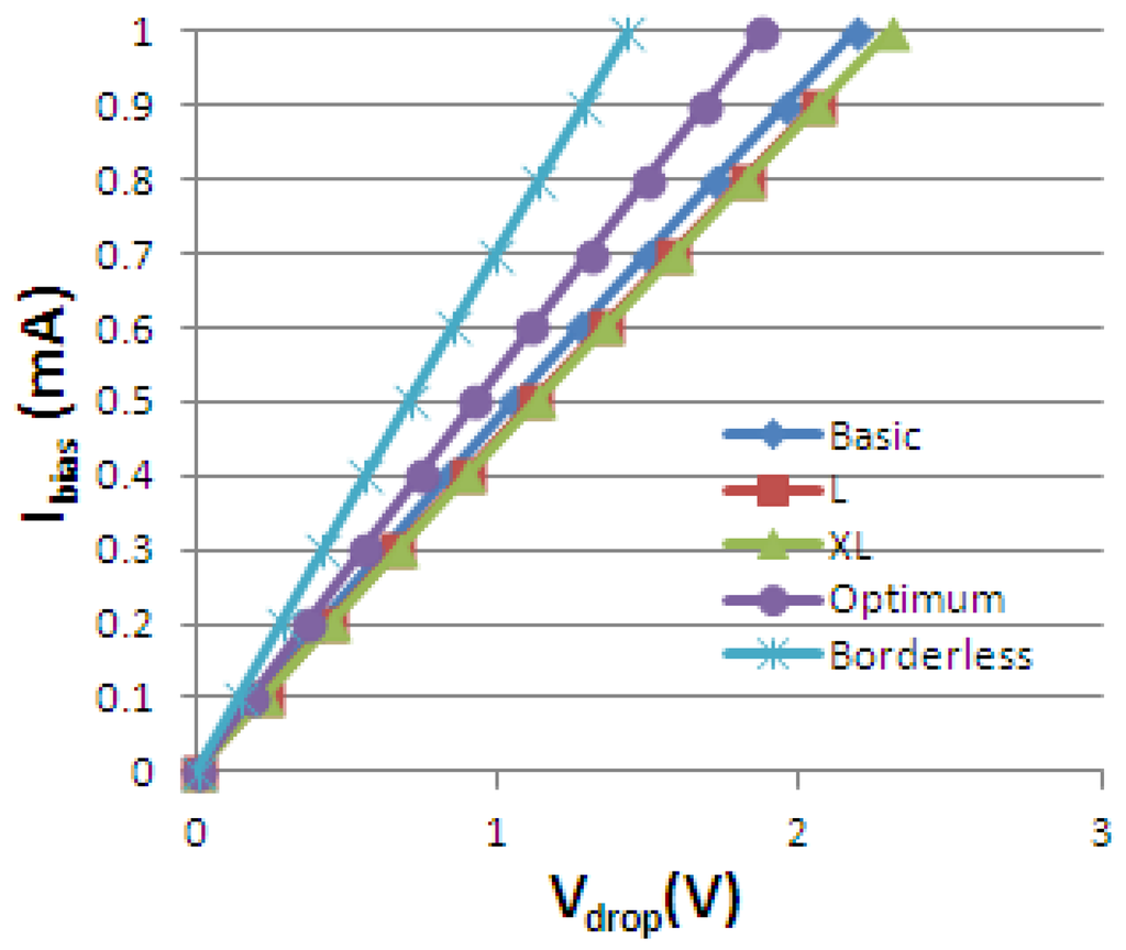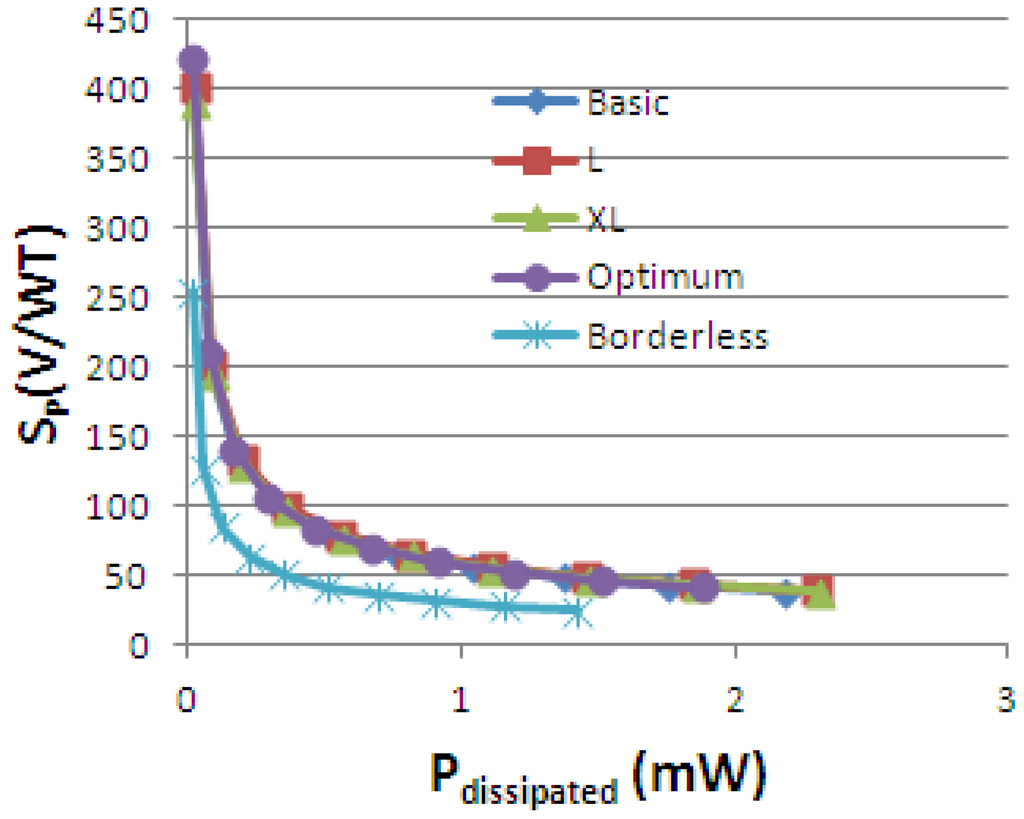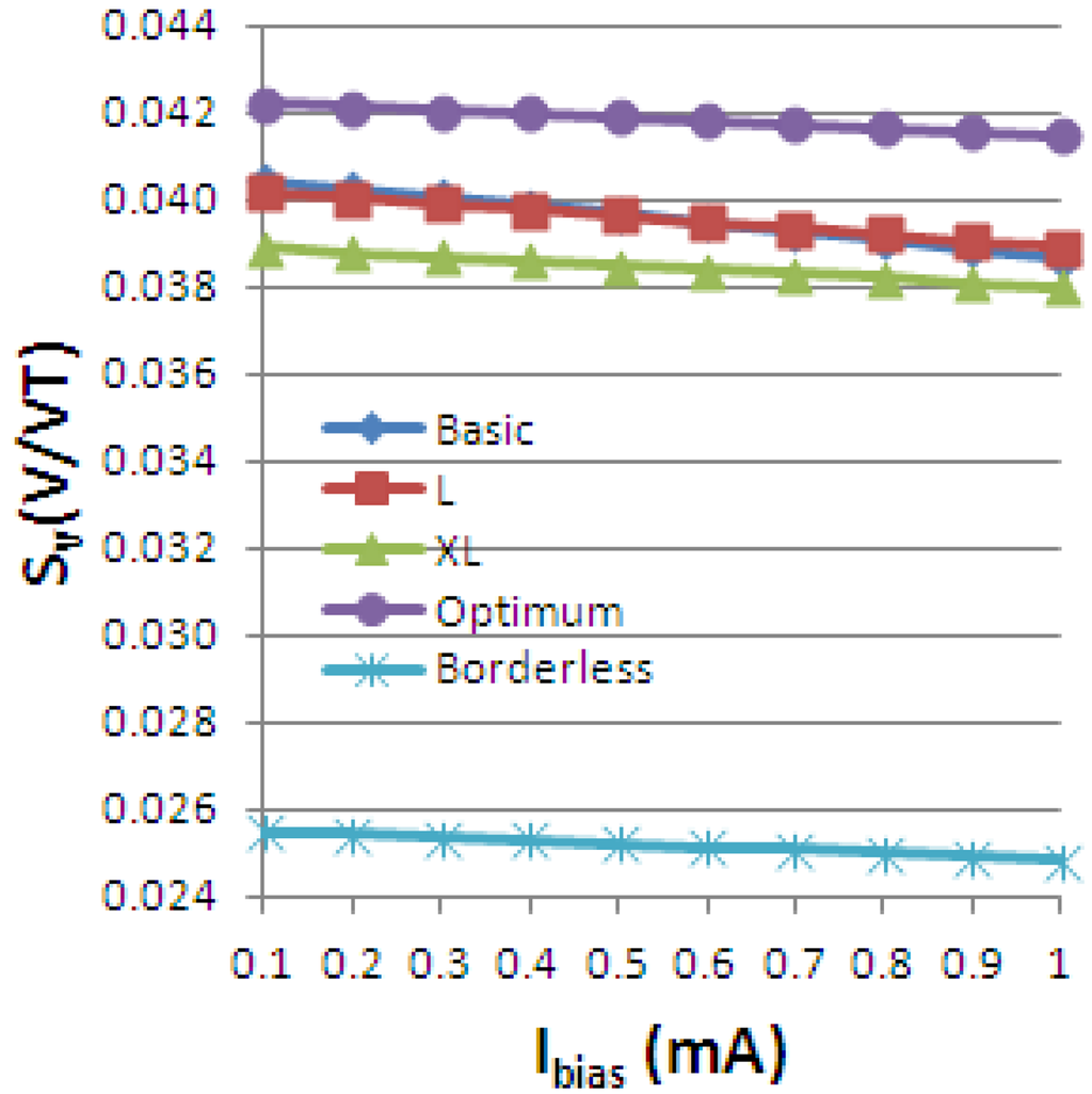 The variation of power-related sensitivity SPvs. the dissipated power is presented in Figure 22. For Ibias = 1 mA, the maximum dissipated power is 2.18 mW for the basic cell, 2.3 mV for L and XL cells, 1.87 mW for the optimum cell and 1.42 mW for the borderless cell respectively. Nevertheless, even if the lowest dissipated power is obtained for low current, we cannot work in that region because the noise is prevalent and the signal to noise ratio (SNR) is too low.