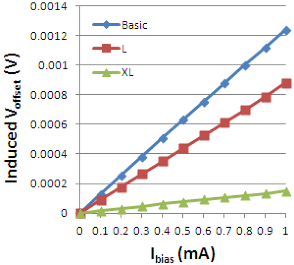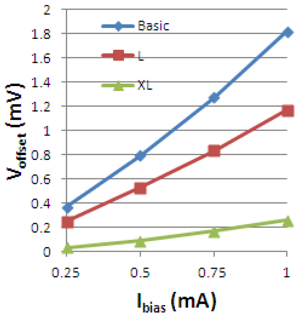 For the XL cell, the influence of the mismatch on the offset was the least. It seems that by increasing the dimensions of a cell we will be diminishing any errors that might appear on the borders and therefore minimizing the offset. This fact was also analyzed in [5] by the authors and experimental data confirms this assumption. Nevertheless the offset is a random process. For correctly characterizing it we need a statistics that could provide systematization of the offset generation possible causes and to quantitatively correlate these influences with the effect on the offset value. This is envisioned in future papers.