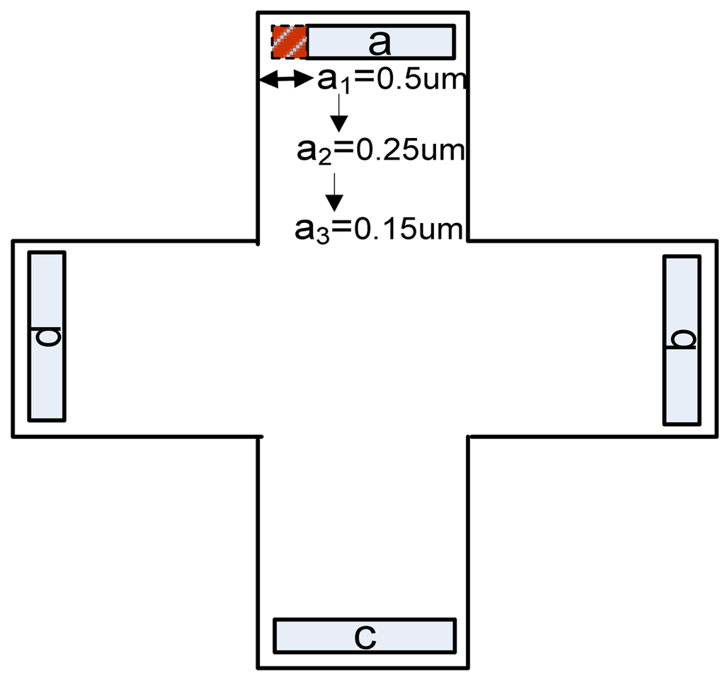 An analysis of the artificial offset is now intended to see how an induced asymmetry can influence the offset and finally find the shape to guarantee the lowest value of this quantity. At this point, we mainly focus on the offset that might be created by a misalignment in the sensors shape. The Hall devices are equipped with two biasing contacts (a and c) and two sensing contacts (b and d). The following figure presents how the asymmetry was induced, for cross-like Hall cells, in the first instance on the biasing contact a by removing 0.5 μm (asymmetry 1), 0.25 μm (asymmetry 2), 0.15 μm (asymmetry 3), respectively (Figure 25).