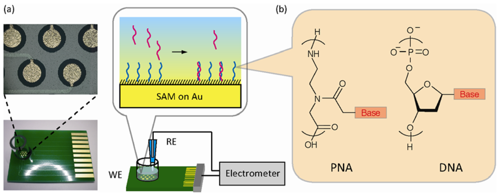 Another approach to gain the sensitivity is the selection of ligands as a capturing element. Typical bioreceptors for electrical biosensing are nucleic acids, proteins, amino acids, antibodies and enzymes. This analyte-bioreceptors interaction yields an electrical signal at the interface. Peptide nucleic acid (PNA), originally developed as a gene-targeting drug, has demonstrated remarkable hybridization properties towards complementary oligonucleotides by increasing thermal stability of the hybrids [–]. Neutral PNA is advantageous for facilitating duplex formation with a complementary DNA sequence. The use of short PNA oligomers as capture probes can result in hybridization with DNA at lower salt concentrations [,]. While, DNA-DNA hybridization suffers from dominant charge repulsion in a low salt solution because of the abundant negative charges in the phosphate backbone. For hybridization to occur, a minimum of 10 mM electrolyte is required to screen out the electrostatic repulsion. These advantages have aided to develop PNA-based sensors for DNA detection using various techniques in recent years []. Uno et al. have previously demonstrated increased electrical signals on direct DNA detection using PNA-immobilized ion-sensitive FET (ISFET) []. The electrical readout of negative charges from captured DNA at the interface using FET devices allows direct detection of complementary DNA without the need for reporter molecules and labeling [–].