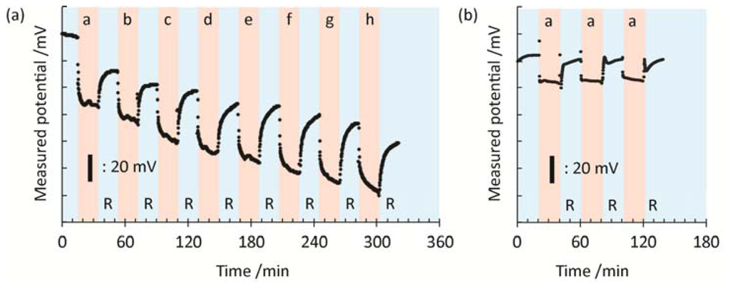 Figure 2 represents the time course of the potential response during the hybridization/rinse measurements in a stepwise manner using the microelectrode in the potentiometry. First, we recorded the potentials in the blank hybridization buffer solution (5× SSC) and in the rinse buffer (0.1× DPBS) as the standard voltages. Then, different concentrations of DNA target were introduced from the most diluted one to the most concentrated one in a stepwise manner. The average voltage response during the last 3 min before changing the solutions was compared at the different concentrations of DNA target. Changes in the potential in the solutions of DNA target (“b–h” in Figure 2) are essentially derived from an increase in the negative charge density at the interface because of the specific and nonspecific bindings of DNA target onto the sensor surface. Note that the charge density is also changed by the ionic strength and composition of the buffer solution. While, the recovery of the potential during rinsing (“R” in Figure 2) is mainly caused by the removal of weakly or nonspecifically bound DNA target from the electrode surface. The shapes of the signal in the target and rinse solutions represent association and dissociation processes of DNA target which can be theoretically modeled by the Langmuir equation. The gradual changes in the potential are mainly caused by the association and dissociation processes with slow time constant which can be interpreted as a weak nonspecific interaction of DNA target with the sensor surface. The specific hybridization reaction between the probe and target occurs within a shorter timeframe. Therefore, the incubation and rinsing periods of 20 min are enough for extracting the changes in the charge density generated by the hybridization.