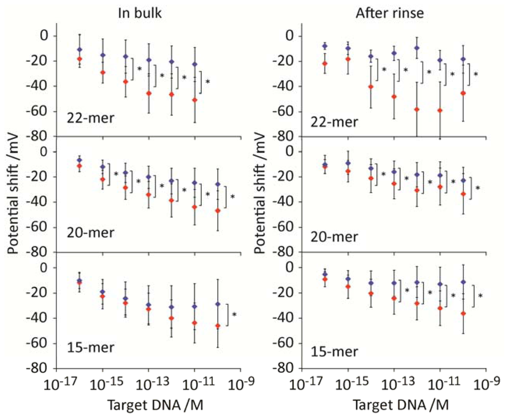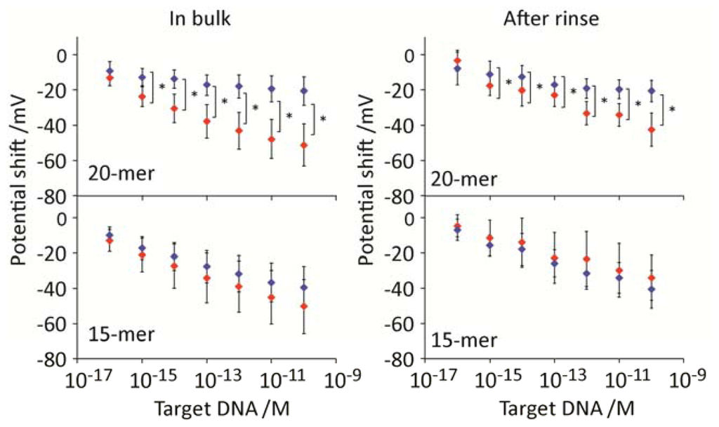 To compare the sensitivity between PNA and DNA probes, we conducted control experiments on hybridization using DNA probes with identical sequences to PNA. Figure 4 shows the potential shift as a result of DNA-DNA hybridization. Following introduction of DNA target solution to the electrodes array, negative potential shifts were observed in the concentration-dependent manner. For 20-mer DNA probe, statistically significant signals were obtained at the concentrations higher than 10−15 M both during the hybridization buffer condition and after rinse. While, no distinct signal changes were observed on the 15-mer DNA probes. This is the clear contrast on the increased affinity by using PNA probes for capturing the short DNA target (15-mer). In other words, PNA probe improved the affinity for short oligonucleotides compared with DNA one in potentiometry. However, for oligonucleotide with the length greater than 20-mer, there was no clear contrast on the sensitivity both in the high (hybridization buffer) and low (rinse buffer) ionic strength solutions.