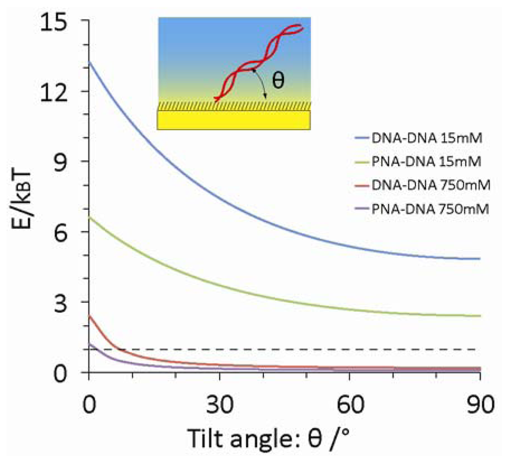 Figure 5 displays the electrostatic energy in terms of kBT for surface-immobilized duplex in 5× SSC and in 0.1× DPBS using above equations. The calculation clearly shows that the electrostatic energy is higher than thermal fluctuation of the molecule (E/kBT > 1) even in 5× SSC buffer at the tilt angles below 8° and 3° for DNA-DNA and PNA-DNA duplexes, respectively. This model also indicates that the electrostatic interaction decreases with decreasing the number of charges and probe length. Therefore, the 15-mer PNA-DNA heterodimer has the weakest electrostatic interaction with the electrode surface. Schuhmann et al. have demonstrated the importance of controlled orientation of DNA probes on a SAM-coated electrode by surface potential for successful determination of DNA hybridization using electrochemical impedance spectroscopy []. In contrast, neutral PNA probes have no electrostatic interaction with the electrode that compromises the sensitivity for the hybridization detection through the potentiometry. In this study, this electrostatic attractive force explains successful electrical readout of DNA target even in the hybridization buffer. Also, the electrostatic interaction may accumulate free DNA molecules in the solution toward the sensor surface. This phenomenon locally increases the apparent target concentration at the interface, allowing highly sensitive detection in the low concentrations of DNA target. Relatively high noise levels observed in the potentiometry may be attributed to the nonspecific electrostatic accumulation of free DNA molecules onto the electrode. Due to the limitation to modulate the surface potential in electrostatic potentiometry, it is quite difficult to confirm this phenomenon. Assembling the mixed SAM with a dithiol as a ternary component may reduce background noises by improving surface coverage and defects of backfilling SAM [,]. Introducing anti-fouling thols instead of MCH for making SAM may be also effective to decrease noises by preventing nonspecific adsorption [,]. Another reason for influencing on the results is the dramatic conformational change of the single-stranded probes from globular shape to the rigid rod-like duplex with the persistence length of about 45–50 nm [], which is a clear contrast to that of 1–2 nm for single stranded DNA []. Indeed, the flexibility change of PNA probe upon duplex formation with DNA target can be detected in electrochemical biosensing []. Because the potentiometric sensor detects changes in the charge density and capacitance at the interface as shown in Equation (1) so that the conformational changes should dramatically influence on the sensor signal. The chain flexibility of PNA and polyelectrolytic nature of DNA might change macromolecular conformation of PNA and DNA probes at the interface.